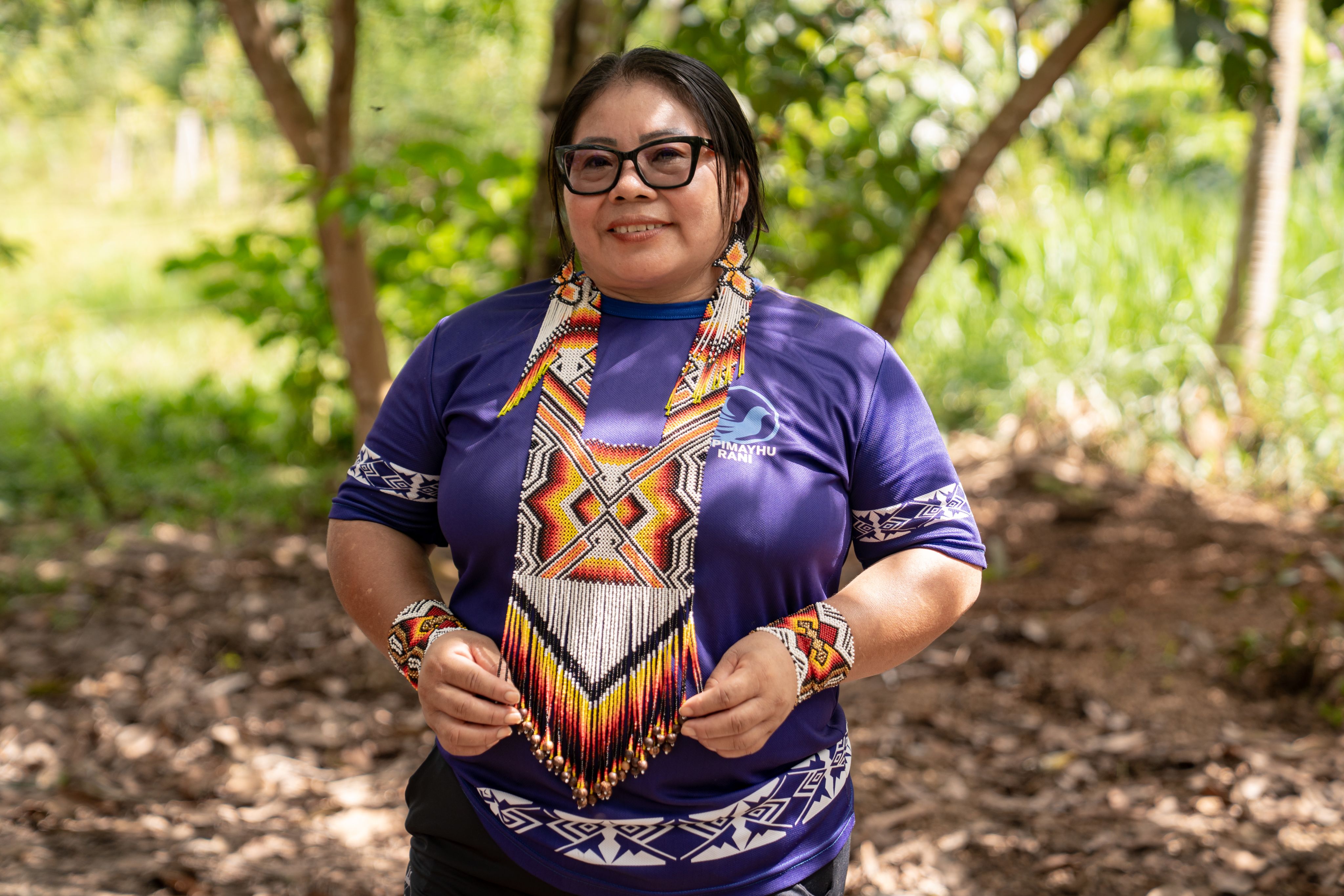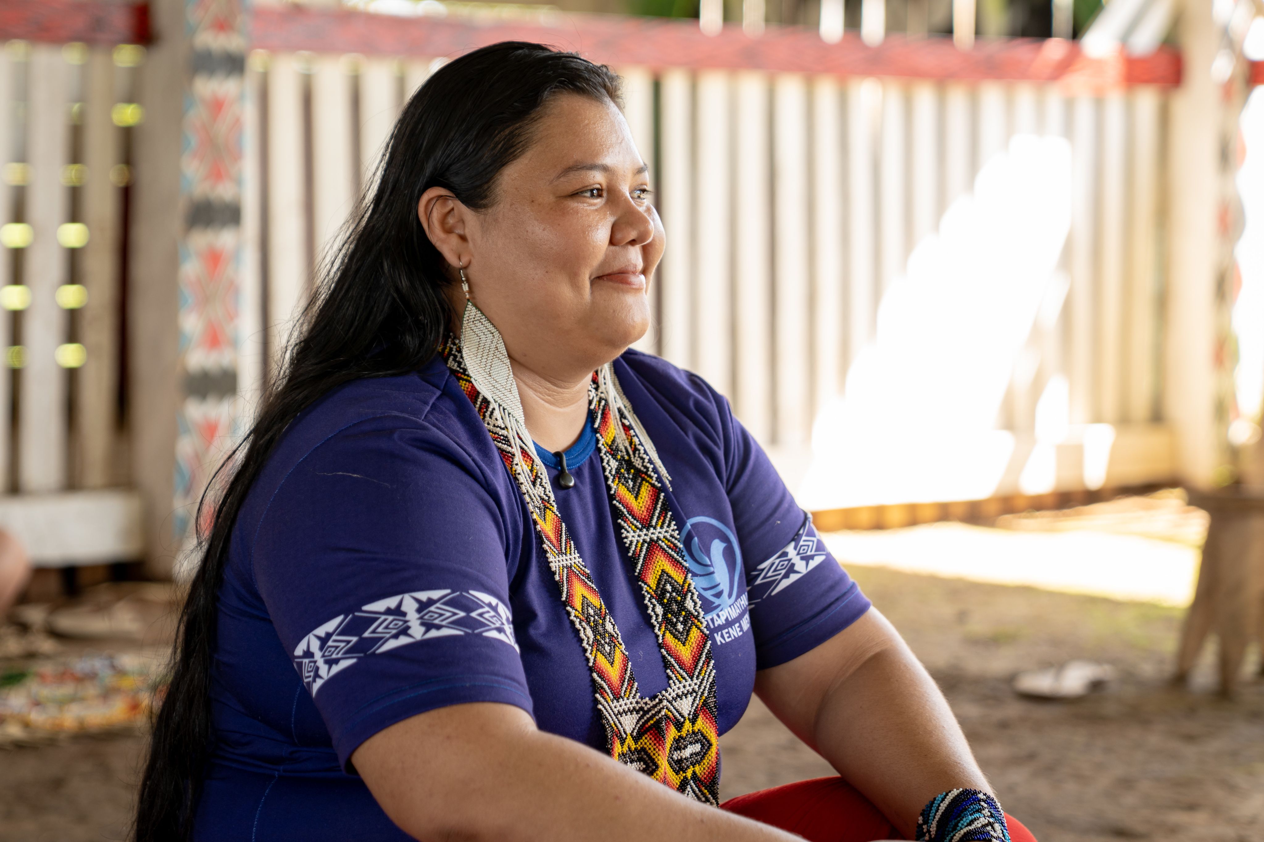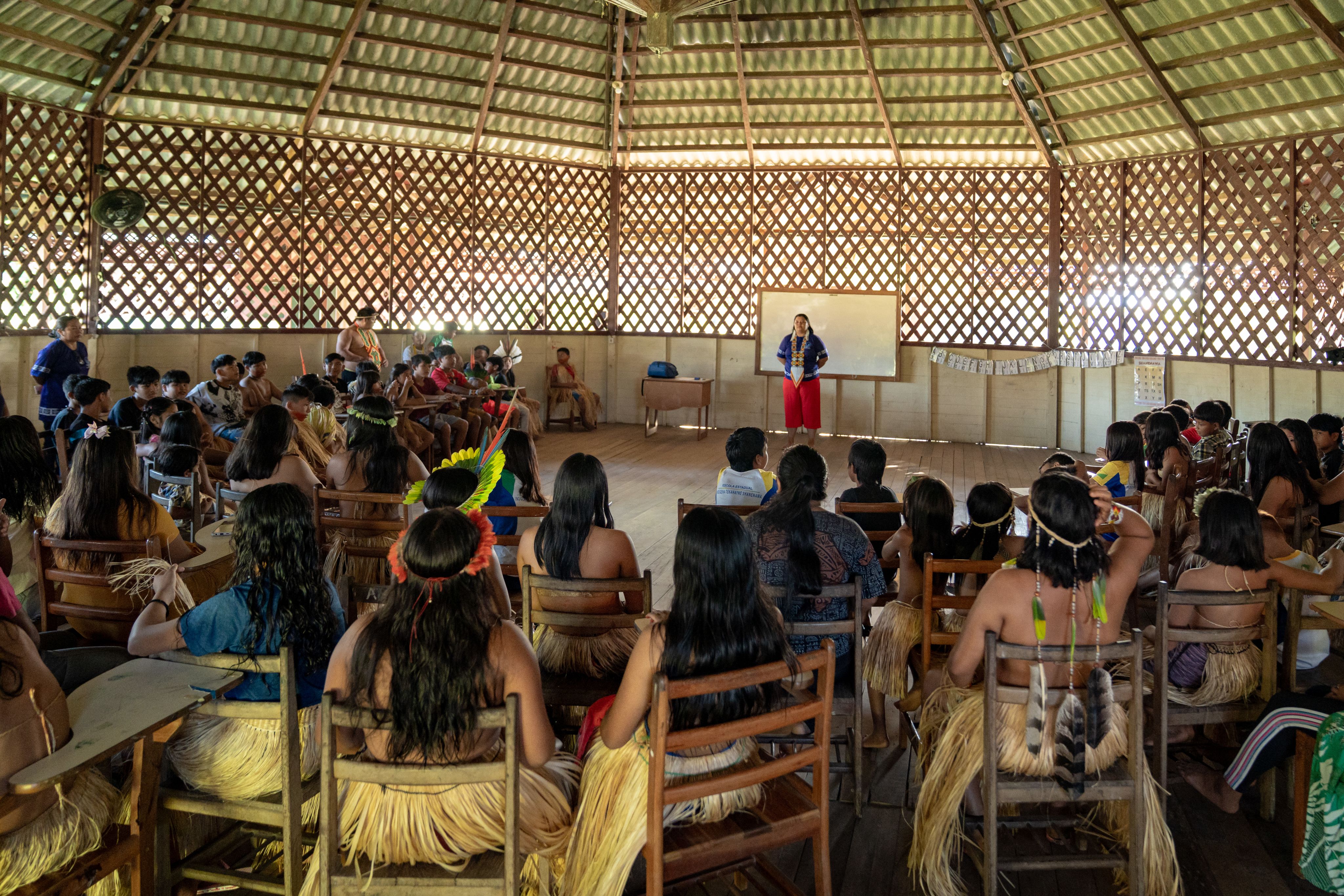 Francisca Andréia de Melo Brandão Shanenawa, ou Kene Meni, leciona na primeira série, orientando seus alunos tanto na parte acadêmica quanto na responsabilidade de proteger a floresta. “Como professora, sinto que estou contribuindo para o futuro dessas crianças”, diz ela. “Ser guardiã da floresta é um papel fundamental. Nossa Mãe Terra, nossa Mãe Água, estão se preparando para sobreviver.” Ela reflete sobre a força das mulheres indígenas em cuidar de seu povo, manter viva sua ancestralidade e transmitir conhecimento às gerações futuras.
