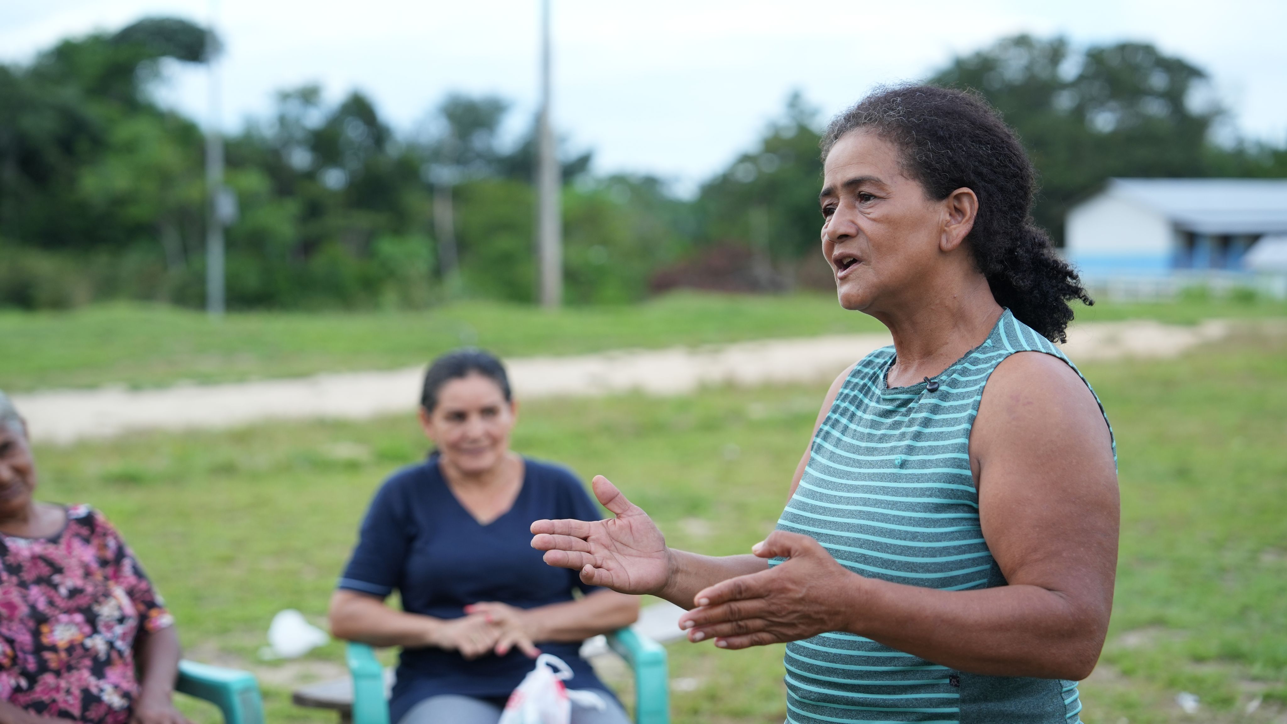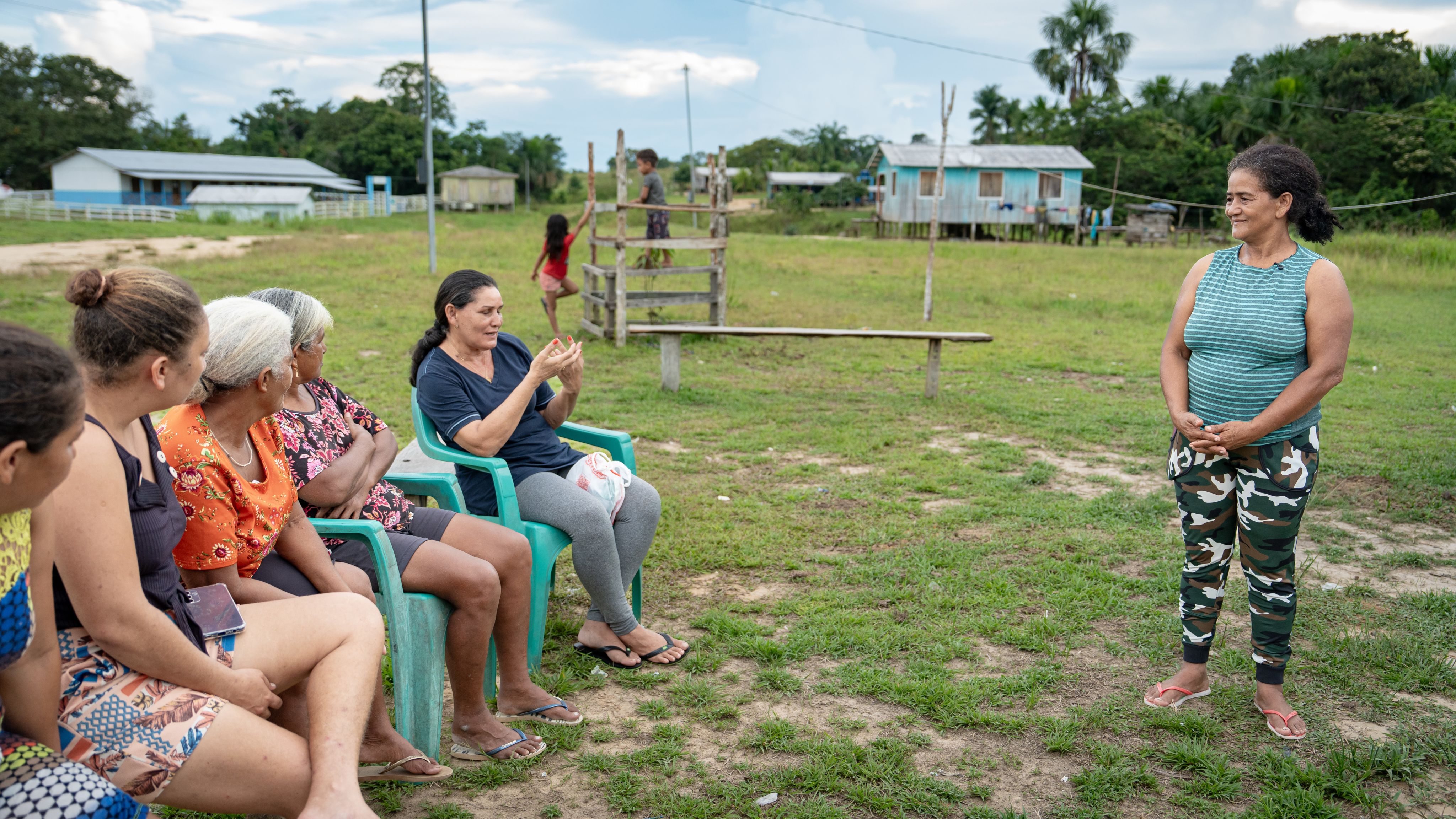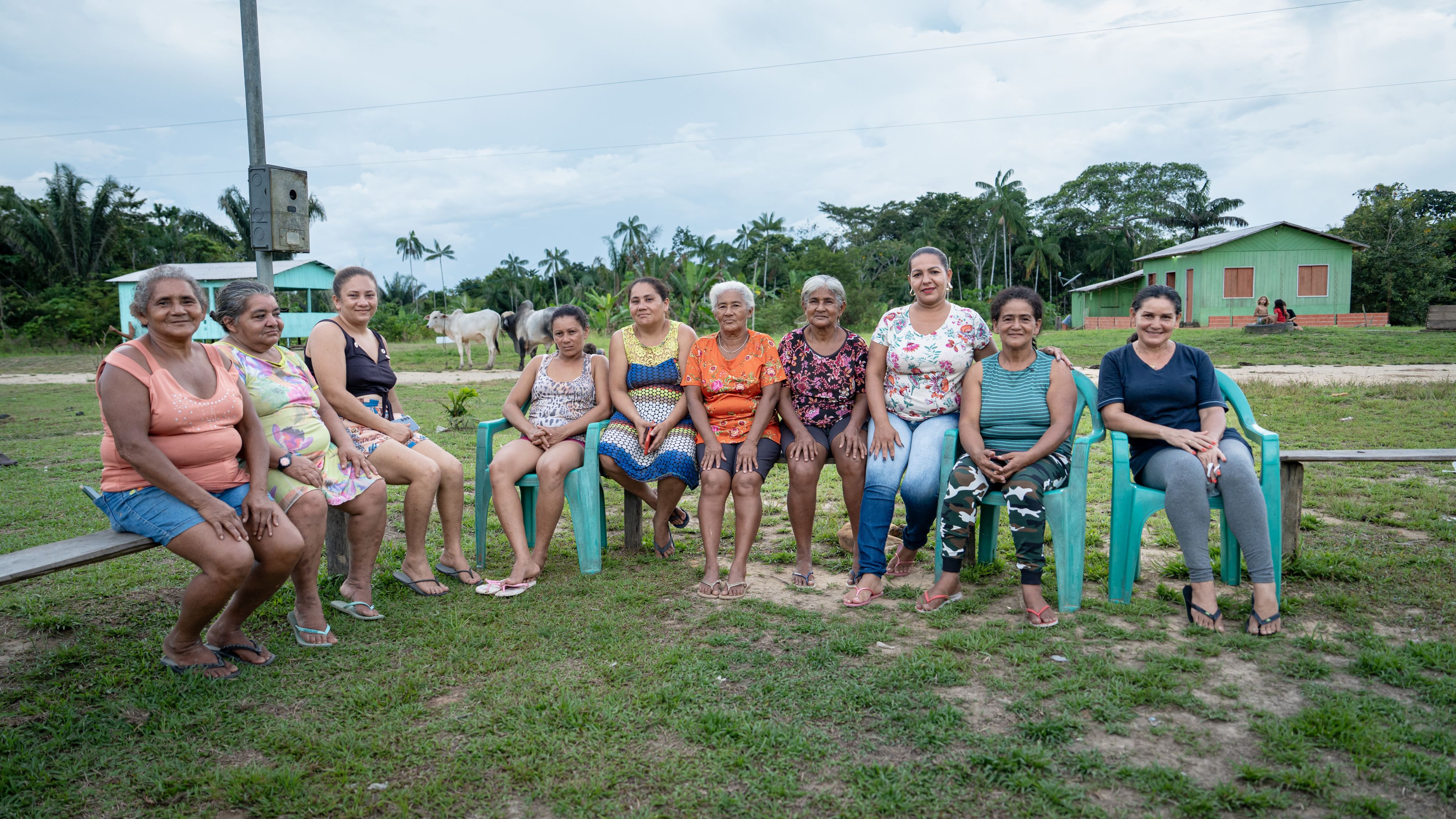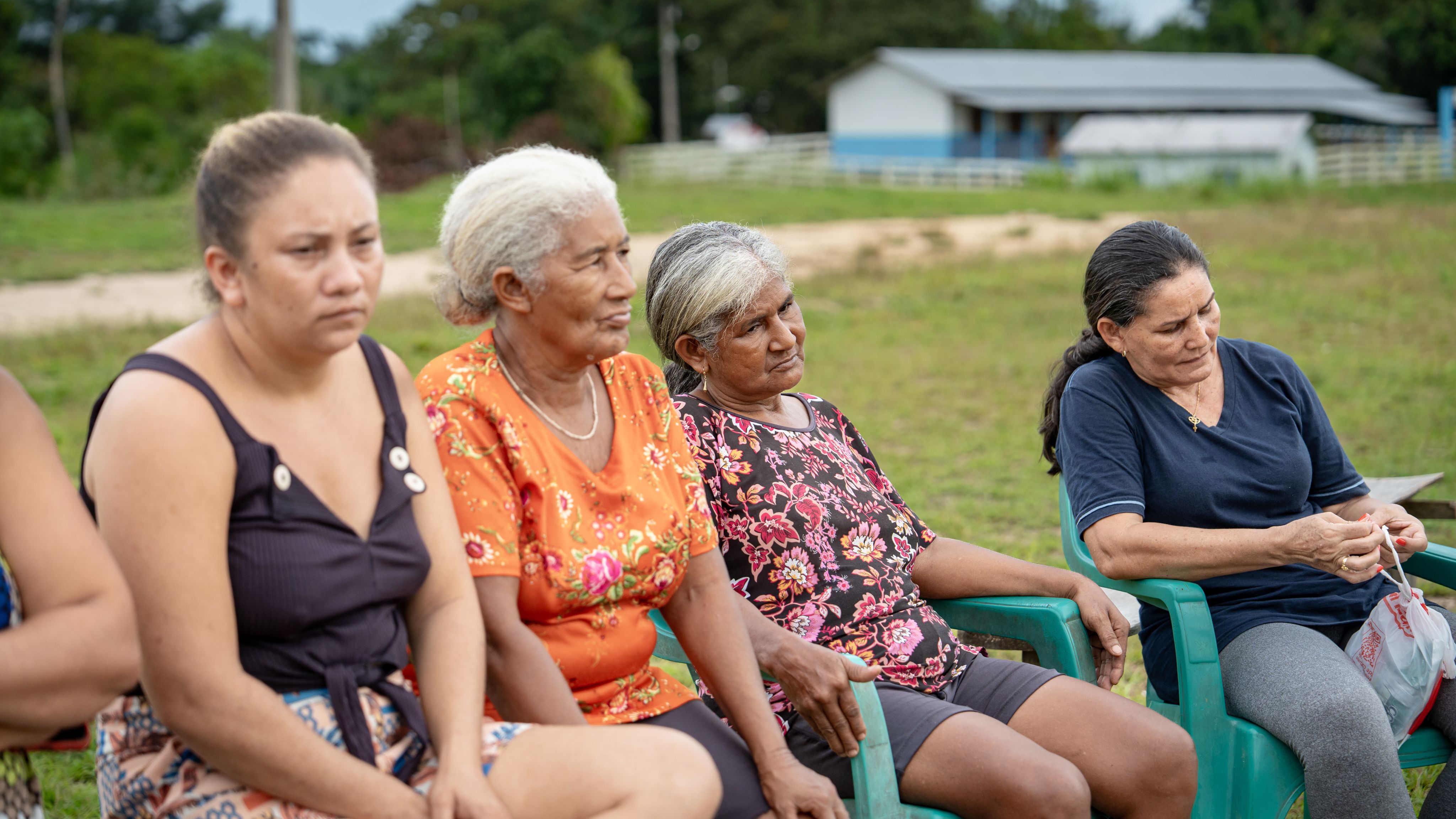 Por meio de sua liderança na associação feminina rural local (Associação Feminina Força da Mulher Rural do Rio Liberdade), Done Branca (segunda da direita) garante que as mulheres, que muitas vezes carregam os fardos mais pesados nas comunidades rurais, tenham suas perspectivas incluídas na governança local e nas consultas comunitárias.