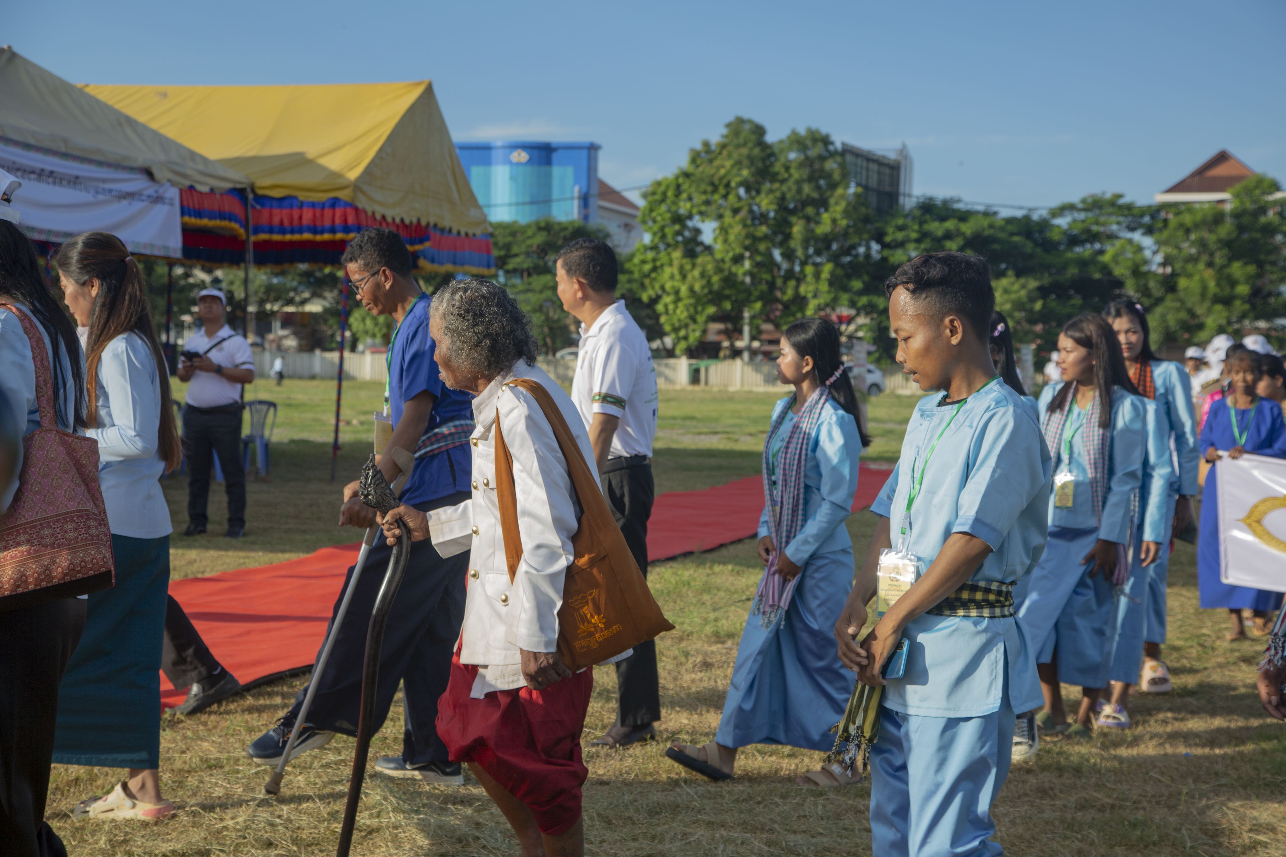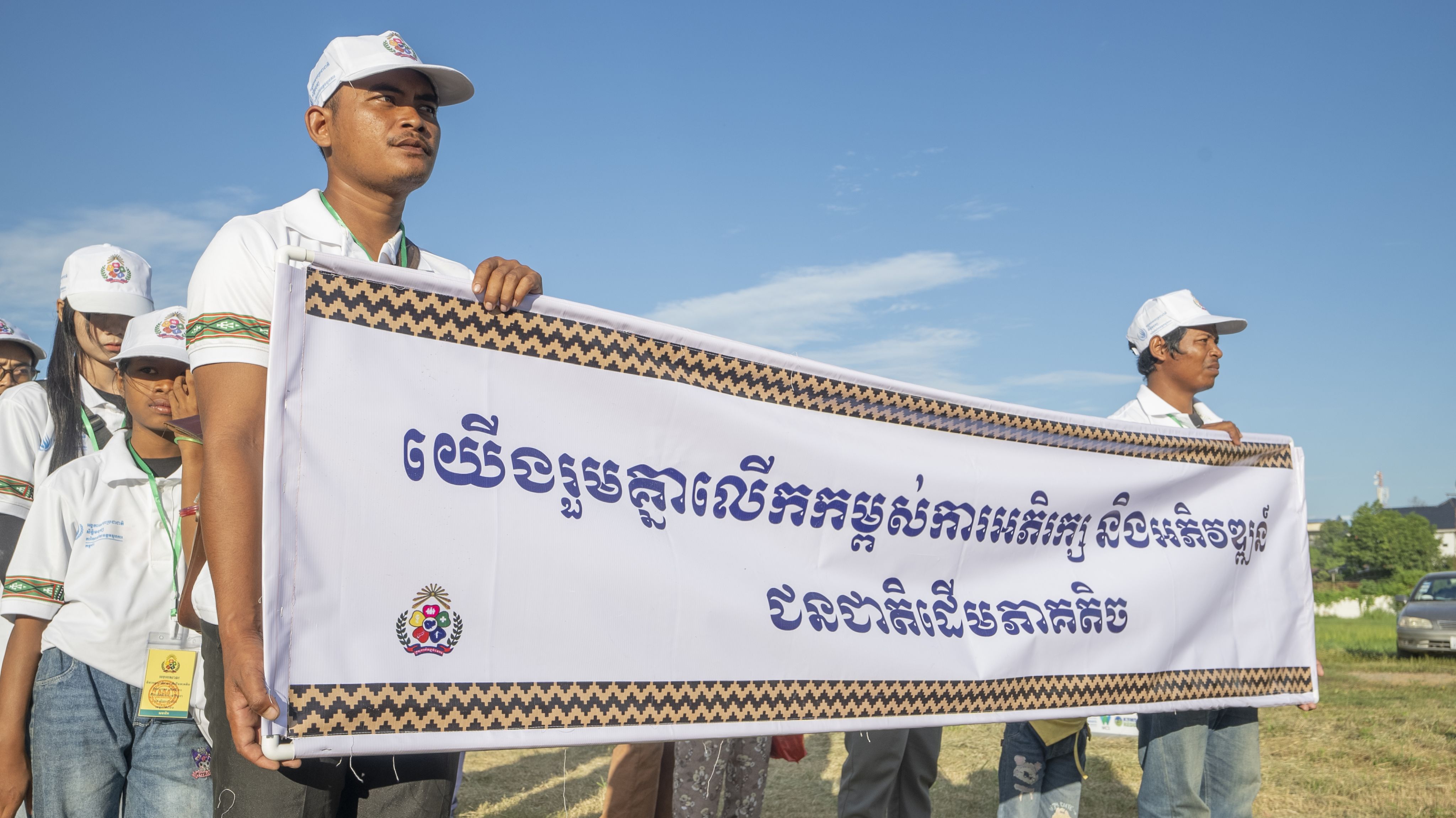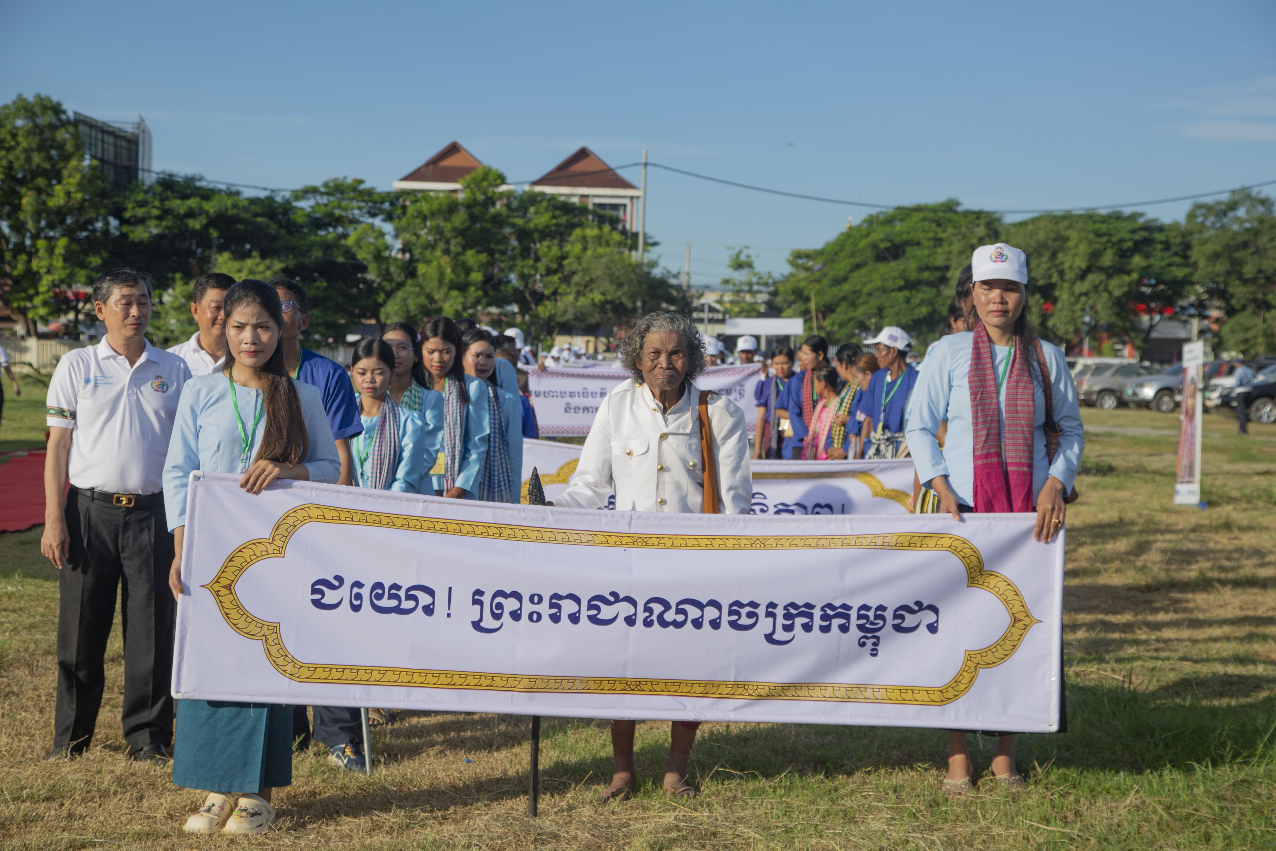 Cheering for unity and pride with a banner that says: "Long Live the Kingdom of Cambodia".