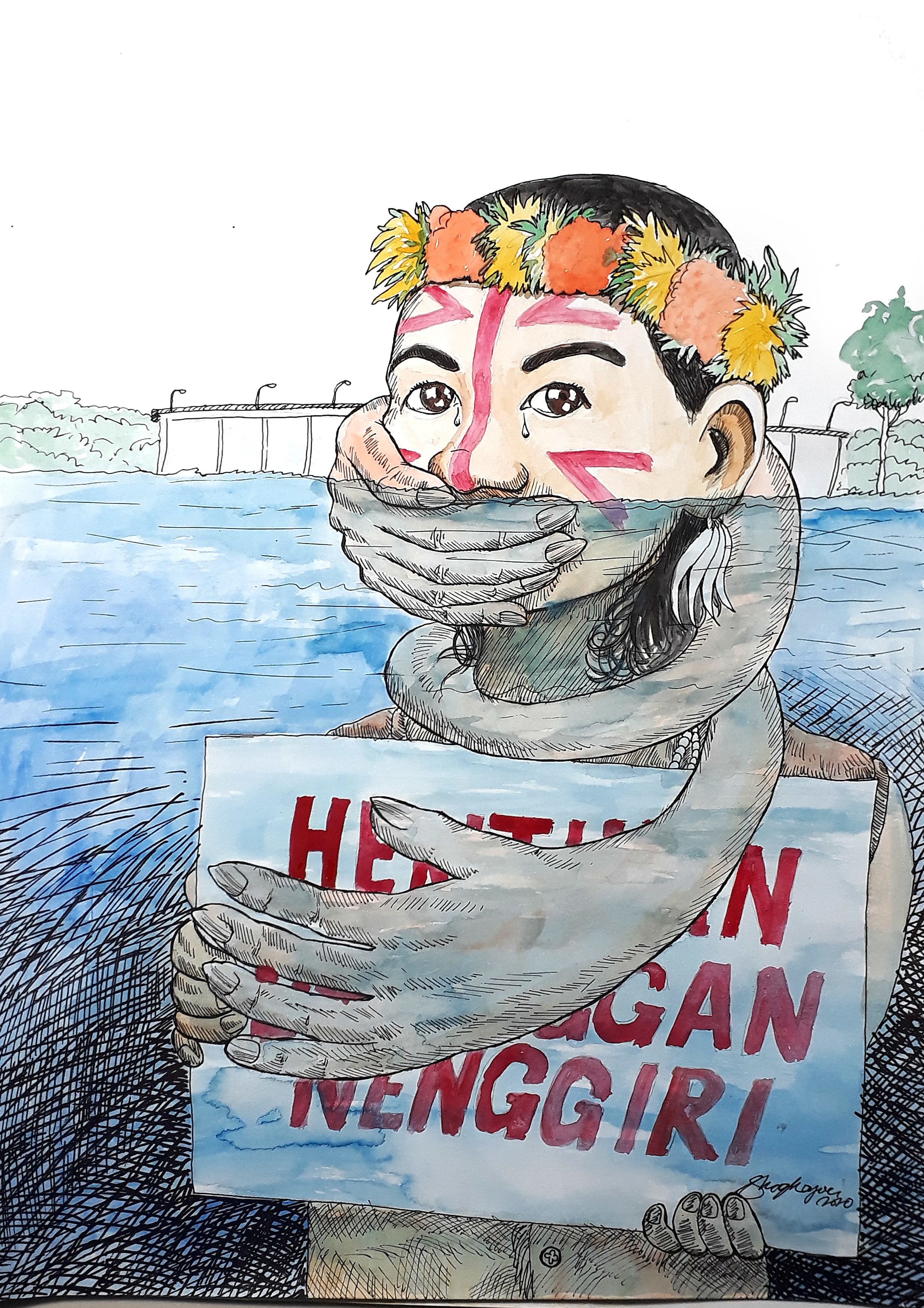 To expand the local port, the reclamation project will encroach on customary land of the Mah Meri. “Villagers are concerned that they will lose the area that has been used for many generations to practice their religion. The Mah Meri people need to perform a ritual ceremony called “Puja Pantai”, so as to have a safe journey when they go fishing in the open sea. In this painting, I tried to reflect what I have been witnessing, hoping it will make people realize progress doesn’t mean you need to kill others in the process. I used the color grey to portray the dead mangrove trees along the coastline. The stormy clouds symbolize the dark future ahead – if these development projects continue.”