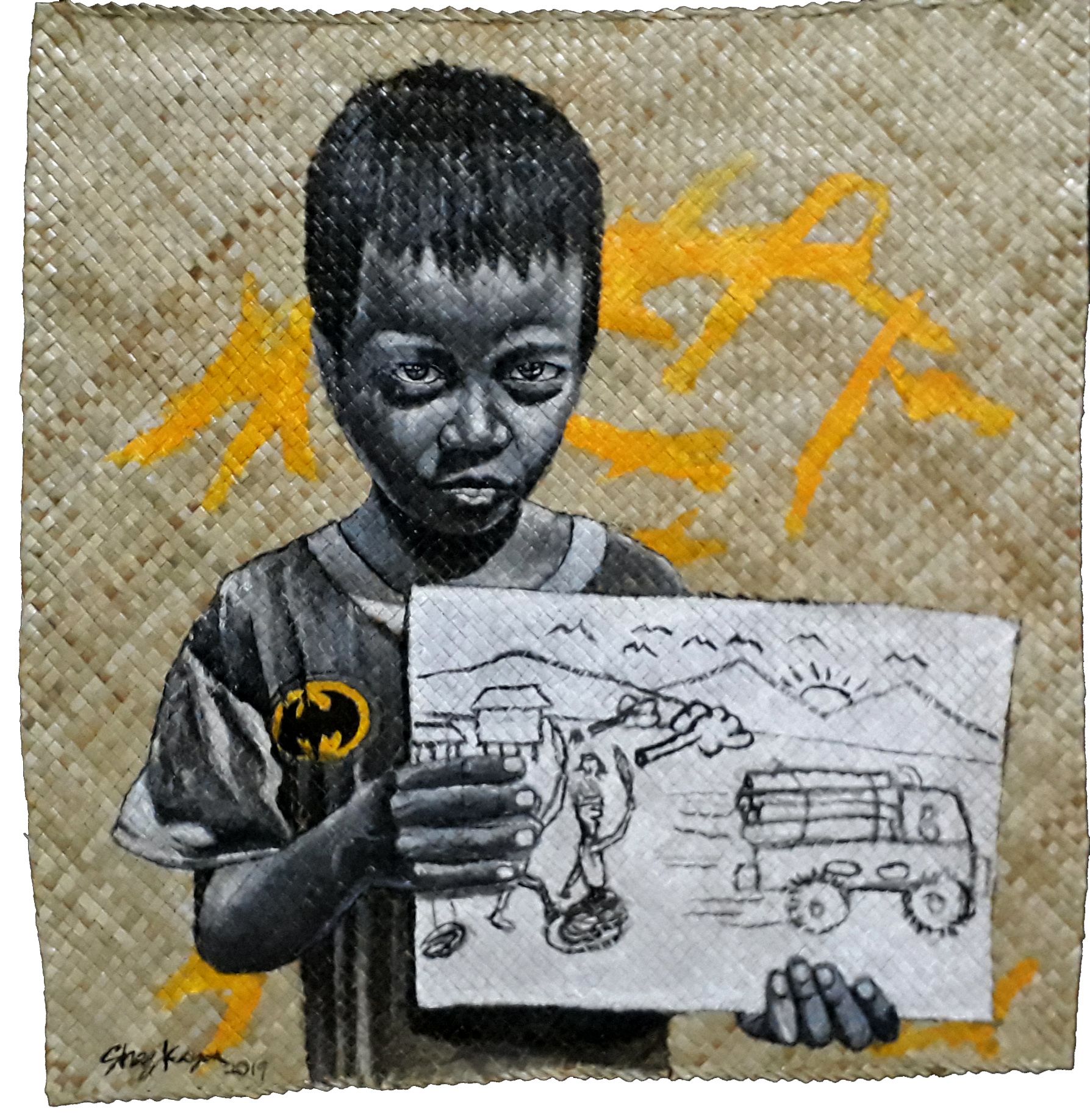 Shaq Koyok has produced artworks on and via a variety of mediums. For some colors, he resorts to using the peel of certain fruits, such as rambutan or mangosteen. He also paints on pandanus mats, made from fresh leaves of the pandanus palm. With the latter, Shaq hopes to uphold the heritage and identity of his community, since the art of pandanus weaving holds significant cultural and economic value among Malaysia's Orang Asli.