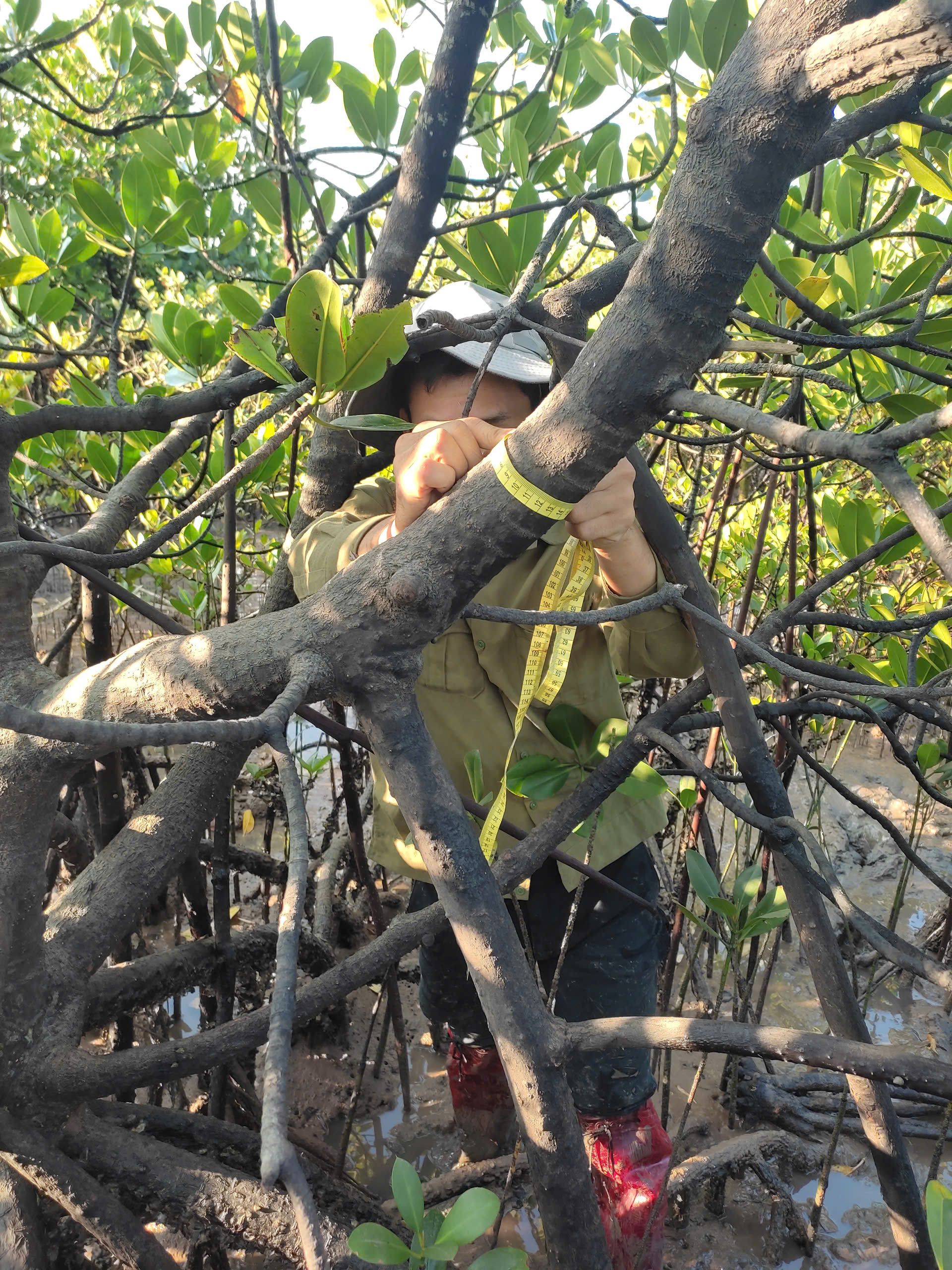 Monitoring teams measure mangrove trunk diameter and canopy cover to assess forest health and track ecosystem changes over time. Photo: UNDP Viet Nam